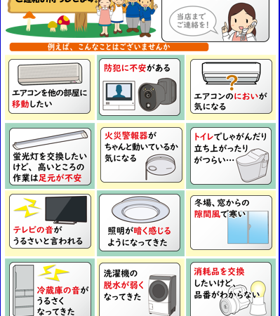 家電の販売・修理はもちろん、太陽光・蓄電池、お風呂・キッチン・トイレのリフォームなど、暮らしのお困り事はまるごとお任せください。切磋琢磨した確かな技術力で対応させていただきます。